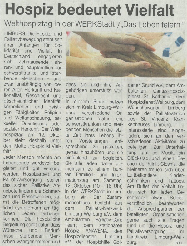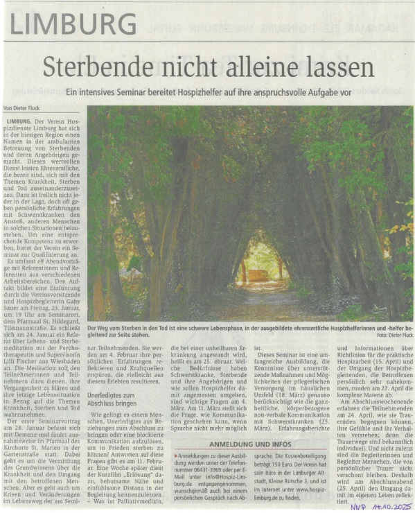 Wenn es einen Themenbereich gibt, der wirklich alle Menschen gleichermaßen betrifft, über den jedoch kaum jemand gerne spricht, dann geht es um Sterben und Tod. Um todkranke Menschen und ihre Angehörigen in der letzten Lebensphase zu unterstützen und ein leben bis zuletzt zu ermöglichen, gibt es die ehrenamtlichen HospizhelferInnen. Die Hospizdienste Limburg bieten dazu jedes Jahr ein Seminar zurQualifizierung an.
