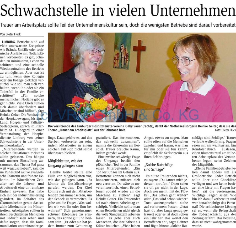 Verein Hospizdienste Limburg Raum zu geben, sich zu präsentieren, da beide Vereine eng zusammen arbeiten. So kam es, dass Gabi Vitt, erste Vorsitzende der DKNH und Gaby Sauer, Vorsitzende Hospizdienste Limburg und zweite Vorsitzende DKNH einen Stand gemeinsam gestalteten und den Be-suchern für Informationen zur Ver-fügung standen. Die eingegang-enen Spenden wurden geteilt, ein herzliches Dankeschön geht an die Veranstalter.